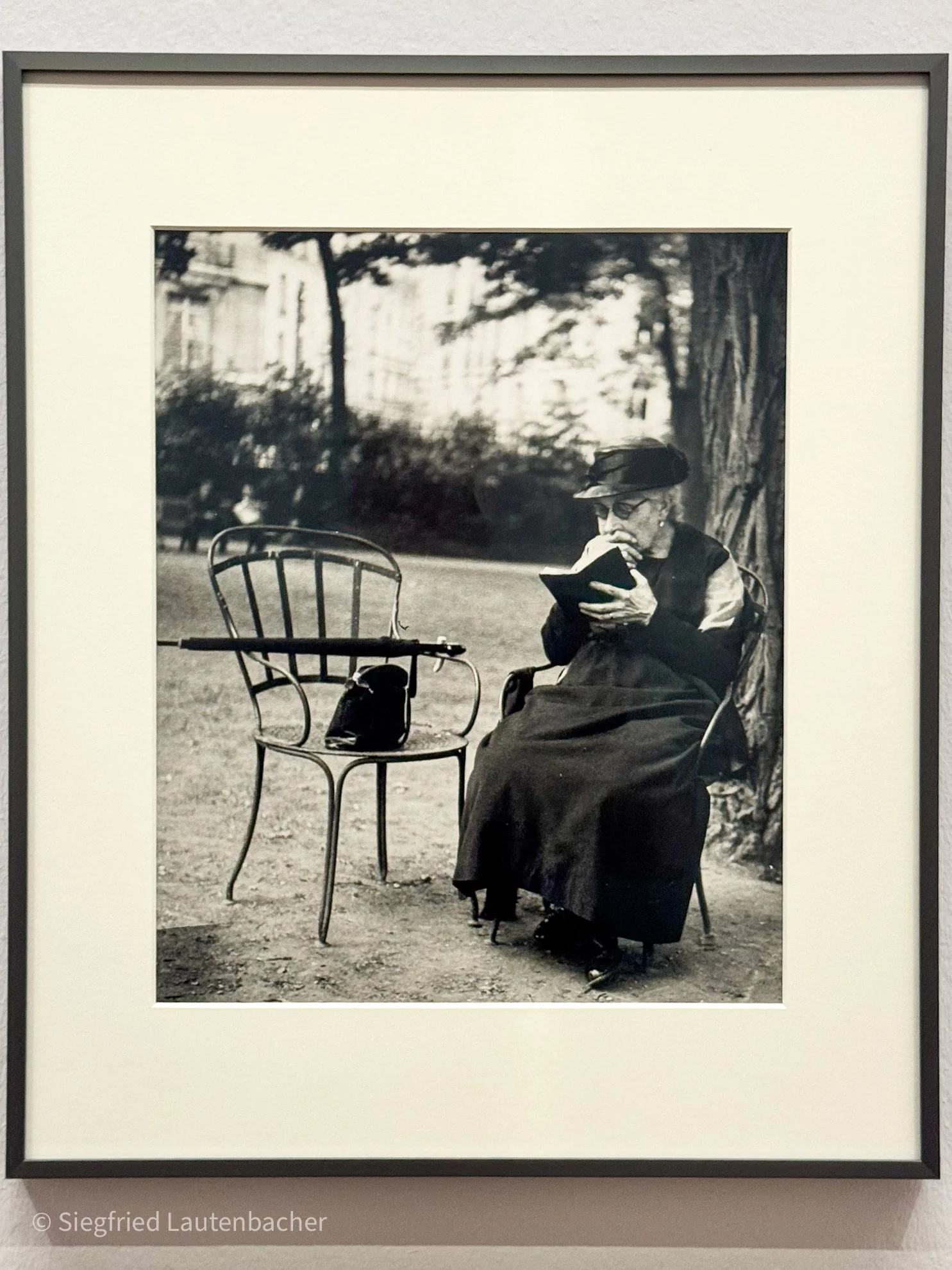 Doch Model kann mehr als beißen. Im Bois de Boulogne, 1937, fotografiert sie eine alte Dame, die im Park sitzt und liest. Das Buch nah am Gesicht - vielleicht sieht sie nicht mehr gut -, die Handtasche ordentlich auf dem Nebenstuhl, der Baumstamm im Rücken wie ein Schutz. Keine Satire, keine Entlarvung. Nur ein Mensch, der sich eine Insel im öffentlichen Raum geschaffen hat.