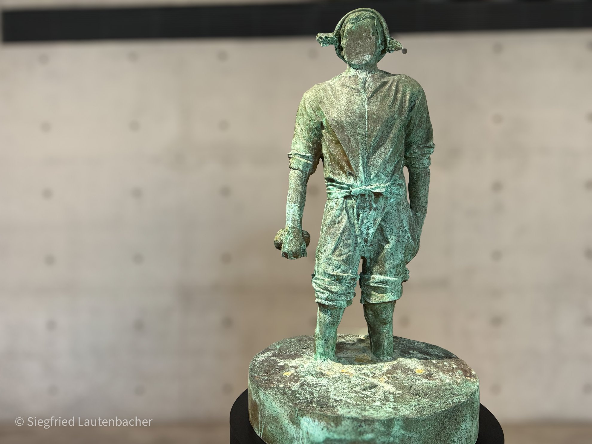 One figure, in particular, draws my gaze: the much smaller "Man without a Face" from 2018, a bronze figure with a greenish patina standing at the far end of the room. While the three monumental figures dominate the space, this intimate sculpture forms an almost private counterpoint to their anti-heroic monumentality. It is faceless—the countenance is cut off, ground away, erased. But upon closer inspection, a mystery reveals itself: he is carrying something in his right hand. Is it the severed face? A gesture that oscillates between loss and desperate preservation, between destruction and a helpless offering of what is lost.